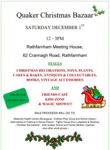 Please support the work of Irish Quaker Faith in Action (IQFA) by dropping into the annual Christmas bazaar this Saturday December 1st. It takes place at Rathfarnham Meeting House, Crannagh Road between 12pm and 3pm.